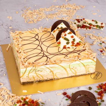 A perfect blend of chocolate and vanilla sponge with roasted almond infused with saffron cream topped with pistachio cream..